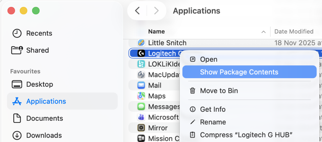 If this is happening to you, you can uninstall the app by opening Finder, navigate to Applications and find Logitech G Hub (or Options+) in the list. Right click (or secondary click/tap) and select ‘Show Package Contents’.